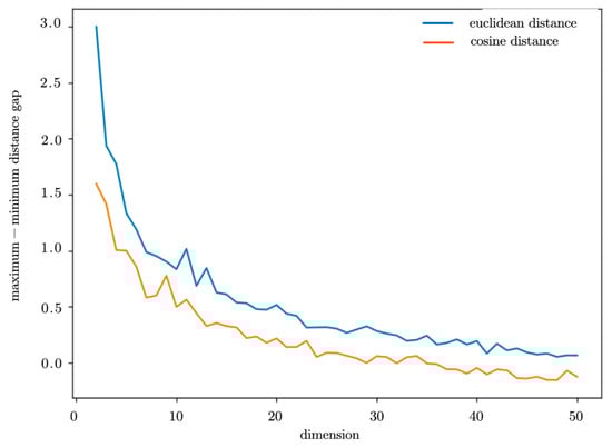 Distance measurement is used to learn a metric matrix that can effectively reflect the distance between data samples by training a given sample set so that the distribution of similar samples in the new feature space is tighter and the distribution of heterogeneous samples more dispersed []. The traditional distance measurement methods, such as Euclidean distance and cosine distance, are used to construct hypergraphs, and good results are obtained in many cases. However, as the field of data science and machine learning evolves, we are faced with more and more complex data types, and traditional distance metrics are often poorly suited to the task [,,]. As shown in Figure 1, with a continuous increase in data dimensions, the calculation of Euclidean distance and cosine distance is affected by the so-called “dimensional disaster” problem. The distances between samples are not particularly stable, and the distances between samples will become nearly equal [,], resulting in the observer’s inability to effectively distinguish the differences between different samples.