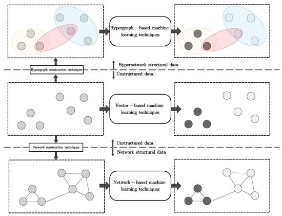 Graph structures are crucial for information encoding, from bioinformatics to computer vision, as the prevalence of complex graph-structured data continues to grow. Data represented in graph structures contain more information compared to data represented in vector form (i.e., information system data) [,,,,]. In ordinary graphs, the edges between nodes only reflect a certain relationship between two nodes. In hypergraphs, the ‘hyperedges’ can contain an arbitrary number of nodes and can reflect relationships that exist among multiple nodes. Machine learning methods for information systems can be classified into three categories: vector-based machine learning methods, network-based machine learning methods, and hypergraph-based machine learning methods [,,,]. The distinction among these three machine learning methods lies in the form in which the information system data are transformed, whether into vectors, graphs, or hypergraphs, followed by the application of different machine learning techniques for data training. The illustration of these three methods is shown in Figure 2.