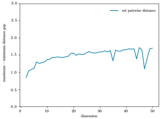 To assess the set pairwise distance proposed in this paper, an experiment was conducted where 500 randomly generated data points were evaluated. The dimensions of the data ranged from 2 to 50. The differences between the maximum and minimum distances were calculated for Euclidean distance, cosine distance, and pairwise distance. The results are illustrated in Figure 3.