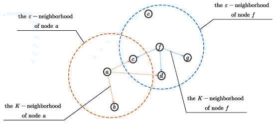 As shown in Figure 4, the ε-neighborhood of node a is , and its k-nearest neighbors are . Therefore, the hyperedge to which node a belongs is . Similarly, the ε-neighborhood of node f is , and its k nearest neighbors are . Thus, the hyperedge to which node f belongs is .