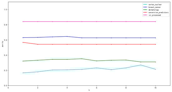 Based on the observed change curves in Figure 6, the conversion_predictors dataset exhibits the highest clustering purity at k = 1, with a value of 0.568. In the case of the breast_cancer dataset, the highest spectral clustering purity is achieved at k = 4, with a value of 0.645. For the dermatology dataset, the highest spectral clustering purity is observed at k = 5, with a value of 0.352. The icr_processed dataset shows consistent spectral clustering purity regardless of the k value, with a value of 0.841. Finally, for the cortex_nuclear dataset, the highest spectral clustering purity is observed at k = 9, with a value of 0.270.