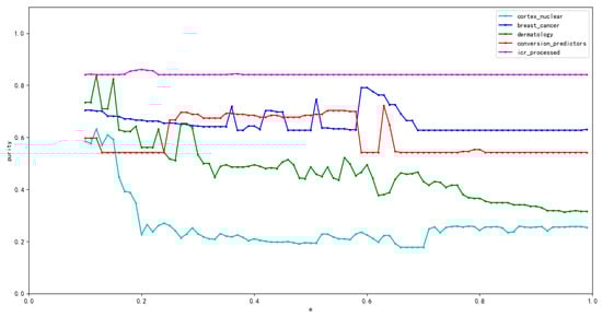 Based on the observed change curves in Figure 7, the conversion_predictors dataset exhibits the highest spectral clustering purity at ε = 0.63, with a value of 0.722. For the breast_cancer dataset, the highest spectral clustering purity is achieved at ε = 0.59, with a value of 0.791. In the case of the dermatology dataset, the highest spectral clustering purity is observed at ε = 0.12, with a value of 0.838. The icr_processed dataset shows the highest spectral clustering purity at ε = 0.2, with a value of 0.861. Finally, for the cortex_nuclear dataset, the highest spectral clustering purity is observed at ε = 0.12, with a value of 0.632.