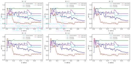 In this study, the construction of hypergraphs involves two hyperparameters, namely, the number of neighbors k and the radius ε. To explore their influence on hypergraph construction, experiments were conducted on five datasets to adjust these hyperparameters. The experimental comparison and analysis were performed on different hypergraph construction methods, including the ones based on knn, ε-radius, and a combination of k-nearest neighbor and ε-radius techniques. The spectral clustering results were analyzed, and the clustering results are shown in Figure 6, Figure 7 and Figure 8.