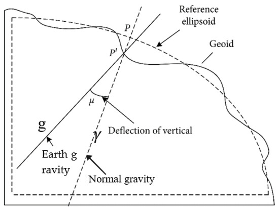 Figure 2 illustrates the concept of gravity disturbance. According to potential theory, the gravity vector corresponds to the perpendicular line of an equipotential surface of gravity. The Earth’s equipotential surface of gravity is highly complicated, and for practical purpose, we often approximate it using a reference ellipsoid model like WGS-84. As depicted in Figure 2, g represents the Earth’s gravity vector at point P and denotes the normal gravity vector at the same point. The gravity disturbance vector, in turn, is the difference between the Earth’s gravity vector and the normal gravity vector. The disparity in their magnitudes defines the gravity disturbance, while the difference in their directions gives rise to the DOV. Owing to the DOV, there exist certain projection components of the Earth’s gravity vector within the horizontal plan, which are referred to as the horizontal gravity disturbance.