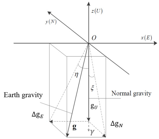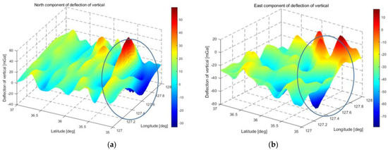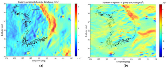 For the DOV, the northern and eastern angular components are represented by and , respectively, as shown in Figure 3. The relationship between horizontal gravity disturbance and the DOV is as follows [7]: