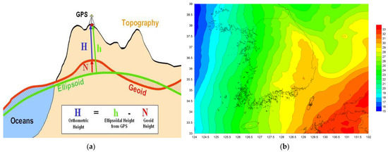 Figure 5a clearly shows the definitions for each of the 3 reference heights and the relationships between each. Figure 5b illustrates the distribution of geoid undulation of geoid height around the Korean Peninsula, displaying a gradual gradient from southeast to northwest, ranging from approximately 15 m to 31 m [23].