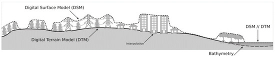 Figure 6. A schematic representation of surfaces represented by DSM (≡ SRTM) and DTM. In this paper, the orthometric height can be obtained from the SRTM DEM.