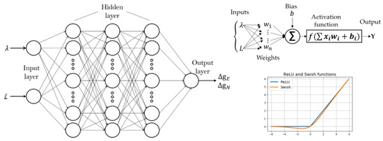 To train the MLP and evaluate its accuracy, a database of gravity disturbances corresponding to the positions of grid points is essential. Achieving accurate gravity disturbance calculations requires a precise gravity model, with the 2160th degree and order EGM2008 model developed by the National Geospatial-Intelligence Agency (NGA) of the United States being a representative choice for the entire Earth. In this study, we constructed a gravity disturbance database for the Korean Peninsula by calculating the SHM of the EGM2008 model on a workstation PC. The gravity disturbance data used for network training were computed at 3 arcsec() intervals for areas near the Korean Peninsula, covering latitudes from 33° to 39° and longitudes from 124° to 132°. This resulted in a dataset of 61,924,800 points used for MLP network training. To validate prediction accuracy during MLP training, a verification dataset of 6,192,480 random locations (10% of the training data) was created. The results are displayed in Figure 4 by MATLAB. In Figure 4a, the parameter of the gravity disturbances over the Korean Peninsula is depicted in a MATLAB graph using the calculated MLP training data. The calculation revealed a positive value in the eastern coastal area of the Korean Peninsula and the nearby sea, contrasting with a predominantly negative gravity disturbance distribution in the western part. Figure 4b displays a MATLAB graph illustrating values across the gravity disturbances of the research area. Notably, exhibited distinct distribution changes in island areas such as Jeju Island, Ulleungdo, and Dokdo, as well as near Mt. Jirisan. The data presented in Figure 4 constitute the gravity disturbance dataset for MLP supervised learning.
