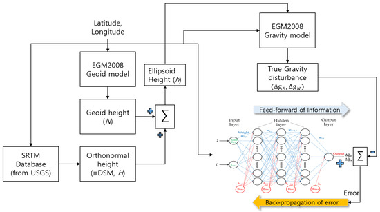 Considering this, we will discuss an MLP-based DOV compensation technique that can be executed in real time on the embedded Navigation Processing Unit (NPU) built into the INS. The key point covered in this study is to ensure that the designed MLP model can be executed in real time on the INS’s NPU. Therefore, the goal of this paper is to design an MLP network model that can accurately predict the DOV calculated in real time on the NPU and prove its performance through field tests. To achieve this, gravity disturbances will be calculated using the 2160th order EGM2008 SHM to generate the training data for MLP.
