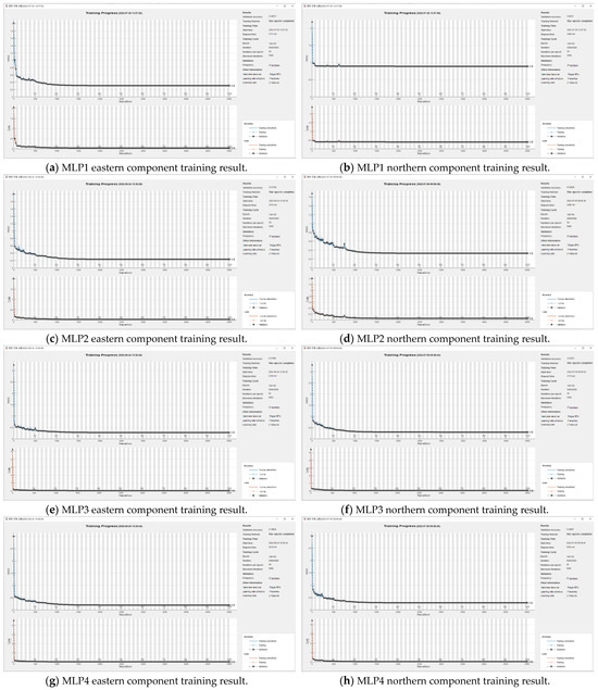 To ensure real-time computation, computational complexity was previously calculated to determine the MLP neural network’s size. This ensures that computation of the gravity disturbance’ eastern and northern components using MLP can be performed in about 1.2 ms. As a result, four different variations of MLP models, labeled as MLP1 to MLP4, were created. The MLP models were trained using supervised learning techniques. Each different MLP model was evaluated based on its training accuracy using metrics like HMSE and RMSE. HMSE is a variation of mean squared error, with only half of the squared errors used in the calculation. This metric is often used when the focus is on underestimating errors. RMSE is the square root of the MSE and provides a measure of the average magnitude of the errors in the model’s predictions. In this study, the MLP4 model demonstrated the smallest error, indicating that it performed the best among the four models assessed. The HMSE for the DOV’s eastern component was 0.0199 with an associated RMSE of 0.1993. For the northern component, the HMSE was 0.0420 and the RMSE was 0.2899.