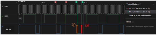 After completing the MLP training, we obtained the biases and weights for each layer of every MLP neural network. These weights and biases were implemented on the INS’s built-in NPU to accurately measure the execution time of each neural network. A logic analyzer was used to record the time difference before and after calculation by the MLP models, and the execution time result of MLP4 is displayed in Figure 10 as a representative example. For context, the execution times were recorded as 1.168 ms for MLP1, 1.113 ms for MLP2, and 1.064 ms for MLP3.