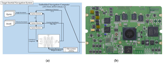Schematic of the internal operational process of the NPU inside the INS: (a) outlines the steps involved in the navigation algorithm calculation and real-time prediction of gravity disturbances within the NPU; (b) photo of actual NPU.