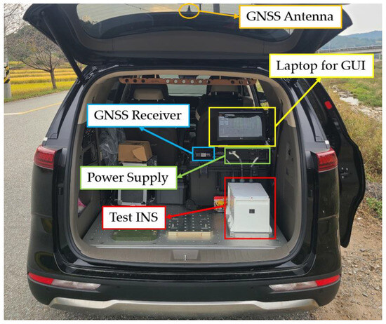 Photograph capturing the inside of the test vehicle. The power supply, GNSS receiver, test INS, and laptop for the GUI were installed inside the vehicle, and the GNSS antenna was mounted on the vehicle’s roof.