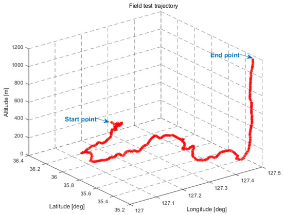 The test was performed on the road from Daejeon Metropolitan City to the summit of Mt. Jirisan. Figure 13 shows the field test trajectory. Most of the test took place on highways with smooth changes of attitude and speed. The vehicle’s moving trajectory began in the lowlands to the north and progressed southward, with a noticeable rapid increase in height near Mt. Jirisan.