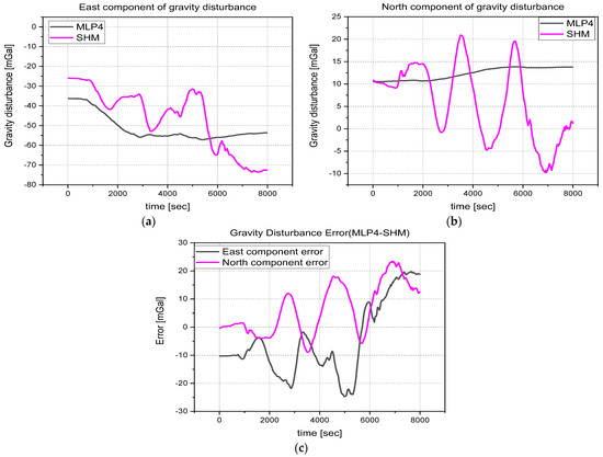 Analysis of the gravitational disturbance in the horizontal plane (eastern and northern components) along the test trajectory. The data labeled as MLP4 represent real-time calculations made by the INS’s NPU, whereas SHM denotes calculations performed afterwards, specifically the 2160th order of SHM at the same location: (a) the eastern component of the horizontal gravity disturbance; (b) the northern component; (c) the prediction made by MLP4, which is then subtracted from the SHM-calculated value. The difference between these values fluctuates within a range of approximately ± 25 mGal.