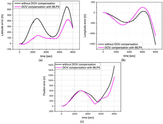 In Figure 16, the effect of DOV compensation on INS position calculation during the vehicle test is illustrated. The black solid line is the result without DOV compensation and the solid purple line is the result of calculated navigation with real-time compensation for the DOV. In particular, the compensation for the DOV during INS navigation calculation resulted in a less position error, with a maximum radial position error showing approximately 27% improved performance compared to without DOV compensation in Table 6.