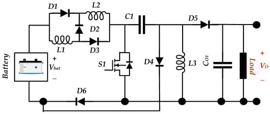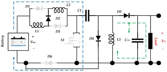 The configuration of the converter during the time intervals when the switch is deactivated can be observed in Figure 4. In this operational mode, diodes D1 and D2 are disconnected, and inductors L1 and L2 are in series with the input battery source. During this mode, capacitor C1 is charging using the battery voltage. It is important to note that this capacitor was in a discharging mode during the first state.