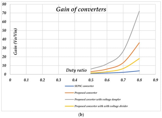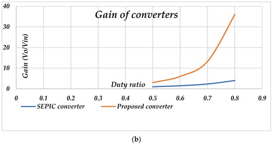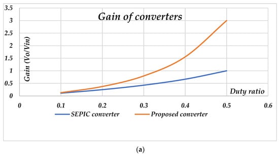 Gain of the proposed converter in comparison with SEPIC and conventional buck–boost converters for (a) 0 < D < 0.5 and (b) 0.5 < D < 0.8.
