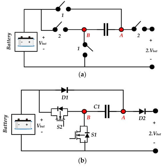 A common application of the switched capacitor converter is in boost converters. To double the voltage across the source, a capacitor is initially connected between the source and the load. This capacitor, after storing the battery voltage, is then linked in series with the source, resulting in an output voltage of 2 Vbat. The schematic for achieving this is depicted in Figure 6a. Here, switch pair 1 operates in a phase opposite to switch pair 2: switch pair 1 closes and subsequently opens to charge the capacitor, while switch pair 2 closes to yield an output of 2 Vbat. Switches can be implemented using transistors alone or transistors in conjunction with diodes, as illustrated in Figure 6b. Transistor S1 is initially open, allowing C1 to charge to Vbat through D1. Following this, S1 is closed, and S2 is open.