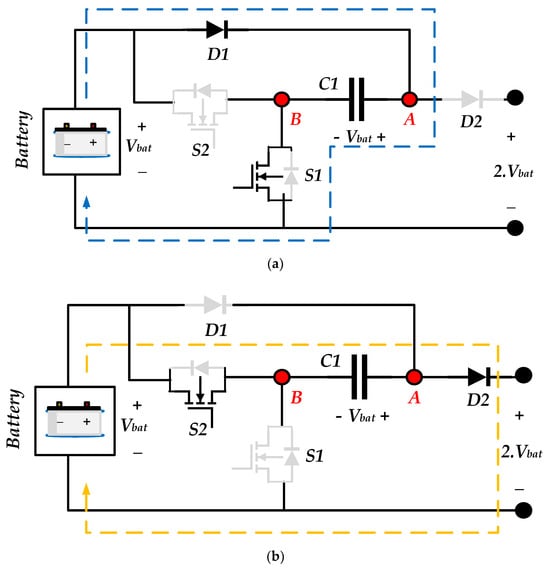 Once capacitor C1 is charged to Vbat, switch S1 is deactivated and switch S2 is activated. Consequently, diode D1 turns off, and D2 comes into operation. This state is visualized in Figure 7b, resulting in an output voltage twice the input voltage at the output point.