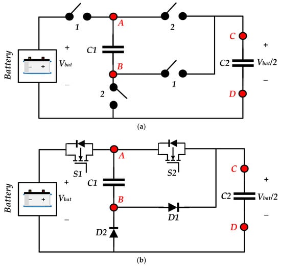 An illustrative example of a switched-capacitor-based buck converter is presented in Figure 8a. As depicted in this figure, two capacitors C1 and C2, each of equal value, are connected in series, resulting in a voltage of Vbat/2 across each capacitor. The capacitors are subsequently rearranged in parallel as the switching sequence progresses, yielding an output voltage of Vbat/2. The switching model employed to achieve this is depicted in Figure 8b, where pairs of switches 1 and 2 operate in reverse-phase order. When the load is active, current flows through the capacitors. However, if the switching frequency is sufficiently high and the capacitors charge within short time intervals, the output voltage remains largely unaffected. Figure 8b showcases a switch-capacitor cell configuration designed to implement the Buck circuit.