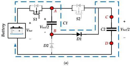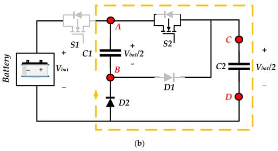 Initially, switch S1 is activated while S2 remains without a switching pulse at its gate-source pins. Consequently, a positive voltage applied to the anode pin of diode D1 turns it on, while diode D2 remains in the off state. Since both capacitors have the same value, the input voltage divides evenly across them, as depicted in Figure 9a.