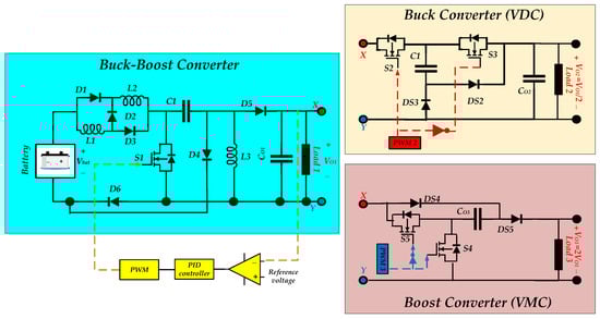 DC–DC buck–boost converters, aptly named for their ability to both lower voltage (buck operation) [6] and elevate voltage (boost operation) [7,8] from a solitary input voltage source, function via the regulation of duty cycle, orchestrating energy transfer between input and output stages. Precision in voltage regulation is realized through common control methods such as pulse-width modulation (PWM).