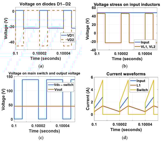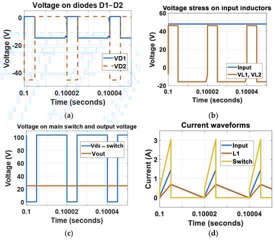 The voltage and current of components in D = 0.5. (a) Voltage across the diodes D1 and D2, (b) input voltage and voltage across the input inductors L1–L2, (c) voltage on switch S1 and generated output voltage, and (d) input source, input inductor and switch currents.