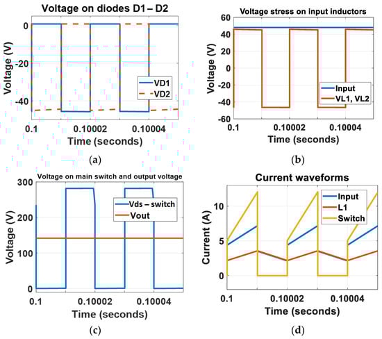 With a duty ratio of D = 0.5, the proposed converter operates as a boost converter. Consequently, the voltage and current at the output nodes are higher and lower, respectively, than the voltage and current at the input side. These operational modes have been comprehensively documented in Figure 13. In Figure 13a, the voltage across diodes D1 and D2 fluctuates between 0 and 45 V. Figure 13b shows that the voltages across inductors L1 and L2 increase, reaching values spanning from −45 to 45. The output voltage generated is the highest among the three different states evaluated. Consequently, the voltage across the drain-source terminals of the switch also reaches its maximum, peaking at 280 V, as illustrated in Figure 13c.