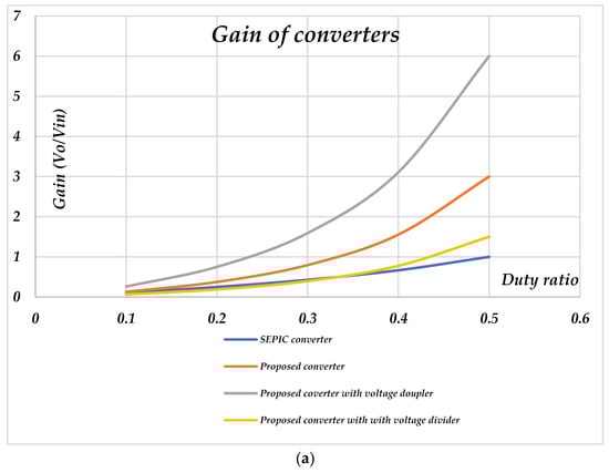Equation (13) represents the gain of the proposed converter. This equation highlights the converter’s ability to achieve very low or high output voltages for different loads connected to the converter’s output side. When comparing the proposed converter to a conventional or SEPIC boost converter, it becomes evident that the achieved gain is quite substantial. Specifically, for a duty cycle (D) of 0.33 in the proposed converter, the output voltage matches the input battery source, whereas in a SEPIC converter, this same voltage is obtained at a duty cycle of 0.5. To visualize this comparison, Figure 5a,b provide graphical representations of the proposed converter and the conventional SEPIC converter for D values below and above 0.5, respectively.