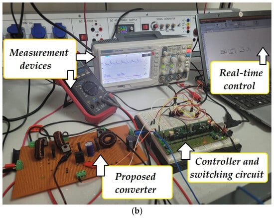 Figure 15a illustrates the integrated topology, which combines the proposed SEPIC converter with VDC and VMC cells. In this configuration, a DC voltage source is linked to the SEPIC converter, and a DSP-based microcontroller, through output voltage sampling and reference voltage comparison, generates precise PWM signals for switch S1. Additionally, the controller produces PWM signals for the VMC and VDC circuits, facilitating the doubling (VO2) and division (VO3) of the voltage generated at the output nodes (VO1) of the SEPIC converter. Figure 15b depicts the setup of the proposed converter’s workbench. This illustration showcases the utilization of a DSP-based microcontroller for the control of the buck–boost converter, accompanied by real-time visualization. The prototype converter has been subjected to rigorous testing, encompassing various duty ratios. These tests encompass the evaluation of the converter’s performance across different operational modes, including buck, boost, and buck–boost.