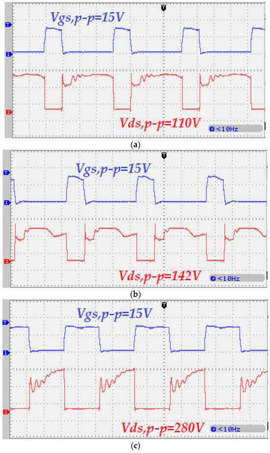 Figure 16a–c specifically depicts the drain-source voltages produced by the switch for duty cycle values of 0.25, 0.33, and 0.5, respectively. As was theoretically analyzed, when D = 0.25, the proposed converter operates as a buck converter, and according to the results presented in Figure 12c, an estimated voltage with an amplitude of approximately 110 V should be observed. Figure 16a demonstrates that the measured voltage aligns with the simulation results, confirming the theoretical findings.