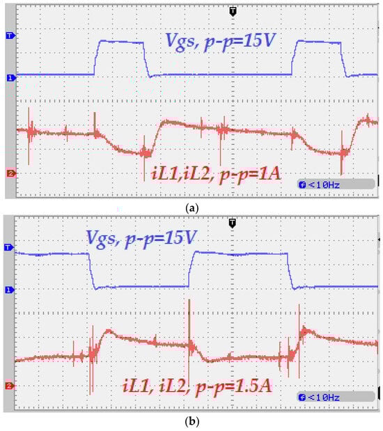As previously mentioned, when using a duty ratio of D = 0.25, the proposed converter operates in a manner resembling a buck converter. In this configuration, with a 48 VDC input voltage, a 24 VDC is generated at the load. For this particular condition, the voltage across diode D1 fluctuates between 0 and −15 V, while the voltage across diode D2 oscillates between 0 and −45 V, as depicted in Figure 12a. The switching voltages generated across inductors L1 and L2, ranging from 50 to −18, are visible in Figure 12b. Since the generated output voltage is lower than the input voltage, the voltage across the drain-source terminals of the switch decreases, reaching levels between 0 and 105 V, as shown in Figure 12c. In the context of this buck converter operation, input currents are generally lower than output currents, as confirmed by Figure 12d. Specifically, the input current varies from 0 to 1.5 A, while the currents in inductor L1 and the switch fluctuate between 0 and 0.6 A and 0 to 3 A, respectively.