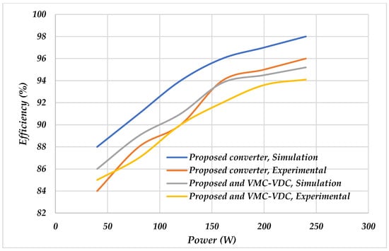 Efficiency curves for the proposed converter and VMC-VDC cells in simulation and experiments.