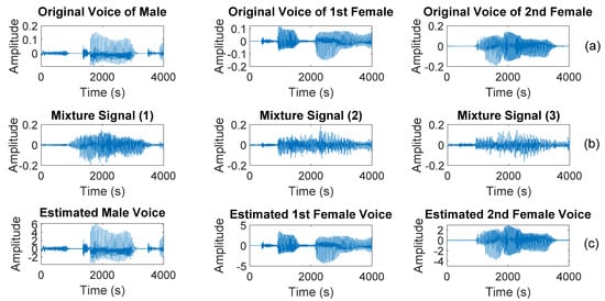 Time-domain waveform of separated signals: (a) original signals, (b) mixture signals, and (c) estimated source signals.