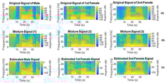Spectrogram of separated signals: (a) original signals, (b) mixture signals, and (c) estimated source signals.