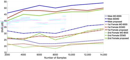 Mixed speech signals were separated by the proposed method for sample sizes of 2000, 4000, 6000, 8000, 10,000, 12,000 and 14,000. Table 1 shows the SNR results of the proposed method, EEMD with MO-BSS, for male and two female speech signals. As the table shows, while increasing the sample size does not affect the separation performance in MO-BSS, it increases the separation performance in EEMD and the proposed method. However, it should not be forgotten that increasing the sample length increases the separation time. Looking at the length of any sample in the table (8000), the proposed method separated all sounds very successfully compared to other methods. Moreover, male voice separation performance is the best of all three methods. This may be related to the frequency characteristics and probability distributions of the male voice. According to the table, the proposed method provided the best separation, followed by EEMD and MO-BSS. When the values in the table are examined, it can be seen that the proposed method is highly successful in both speech signals.