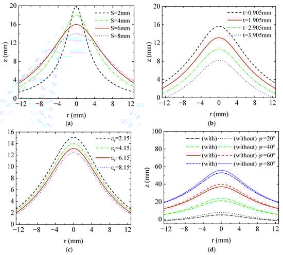 The equivalent phase surface z (in mm) versus (a) distance between antenna source and dielectric cover S, (b) thickness of the dielectric cover t, and (c) relative permittivity of the dielectric cover εr. (d) The equivalent phase surface with and without the dielectric cover.