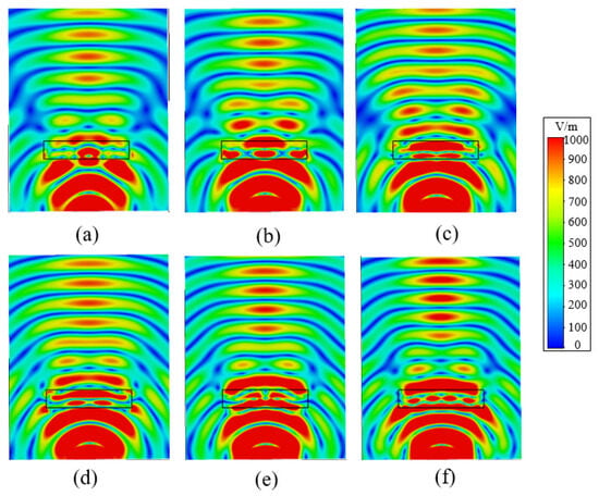 Based on the aforementioned analysis, optimizing the dielectric cover has a direct impact on the wave impedance, subsequently affecting the reflection and transmission characteristics of the proposed antenna. The dielectric cover adopts the Roger6006 with a thickness of 1.905 mm, . To further validate the achievement of wideband impedance matching of the proposed antenna with the dielectric cover, Figure 4 shows the E-fields of the antenna source in the yoz-plane spanning from 58.0 GHz to 68.0 GHz with a step length of 2 GHz. At a distance of 6 mm from the antenna to the dielectric cover, the majority of the energy efficiently transfers through the dielectric cover into free space, with minimal energy reflection across the entire operating bandwidth.
