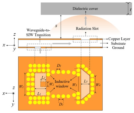 To validate the aforementioned principle, a wideband slot antenna element is introduced, as depicted in Figure 5, providing both a side view and a top view. The proposed antenna comprises four components: the waveguide-to-SIW transition, the SIW, the ladder-shaped slot, and the dielectric cover. The waveguide-to-SIW transition is constructed using a rectangular slot etched on the ground, a copper patch, and metal vias, enabling connection to the standard WR-15 waveguide. The SIW is based on the substrate of the Rogers 5880 ( with a thickness of 0.787 mm, which achieves a simple, compact, and low-profile structure. The ladder-shaped slot is etched on the metal layer of the substrate.