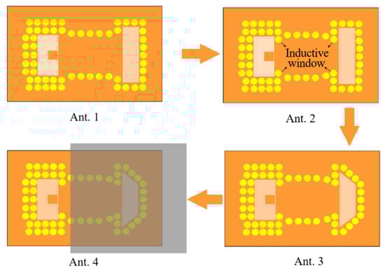 Figure 6 shows the top view of the evolution process with the proposed antenna. Ant. 1 is a conventional SIW rectangular-slot antenna, which is fed by the standard rectangular waveguide of WR-15. Figure 7 shows that Ant. 1 achieves the narrow bandwidth of 4.3%. To enhance its impedance bandwidth, Ant. 2 employs an inductive window, which is formed by two pairs of metal vias close to the rectangular slot etched on the ground and ladder-shaped slot, as shown in Figure 5. The use of an inductive window can increase the resonance. With the inductive window, the input impedance is changed, and the resonances at 59.0 GHz and 64.0 GHz of the proposed antenna element are excited. However, the proposed antenna element cannot achieve impedance matching from 57.0 GHz to 71.0 GHz.