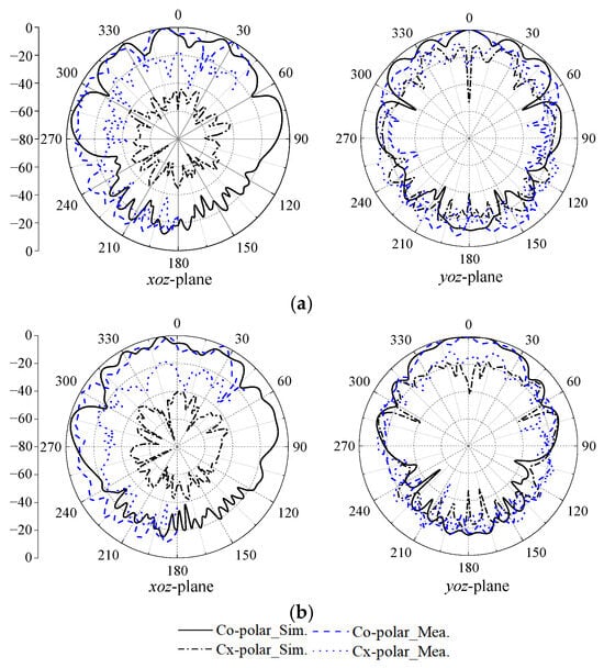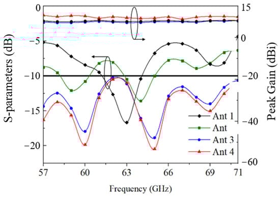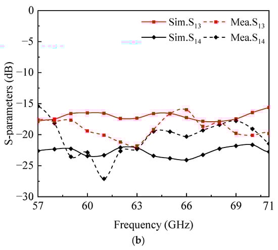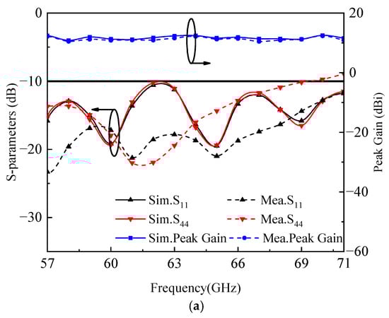 Figure 14a shows both the simulated and measured results of the reflection coefficient and peak gain. The simulation indicates that the antenna elements of the proposed antenna attain a wide impedance bandwidth of 21.9%, spanning from 57.0 GHz to 71.0 GHz. Accounting for manufacturing tolerance, the first and fourth elements achieve a measured matching impedance bandwidth of 19.0% and 21.9%, respectively. Furthermore, the simulated and measured peak gains align closely. Specifically, the simulated peak gain of the antenna element ranges from 9.8 dBi to 12.5 dBi.