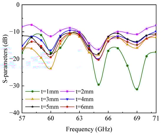 The reflection coefficient and peak gain of the antenna element, both with and without the dielectric cover, are displayed in Figure 7. The antenna achieves a peak gain ranging from 7.0 dBi to 7.9 dBi without the dielectric cover. With the dielectric cover, the antenna can achieve a peak gain ranging from 8.8 dBi to 10.4 dBi. Therefore, the peak gain of the antenna element can be drastically enhanced from 7.9 dBi to 10.4 dBi in the operating band with the loading of the dielectric cover. It can be seen that the dielectric cover has little impact on the impedance performance. The impact on the impedance bandwidth of the distance between the antenna and dielectric cover is shown in Figure 8. When the distance is greater than 3 mm (0.6 @60 GHz), the dielectric cover has little influence on the impedance matching of the proposed antenna. Compared with the microstrip antenna loaded with the superstrate in [12], the impedance bandwidth of this ladder-shaped slot antenna is not sensitive to the distance between the antenna and dielectric cover. Taking into account both the high gain and minimal gain fluctuations, the optimized distance between the dielectric cover and the antenna is determined to be 6 mm.