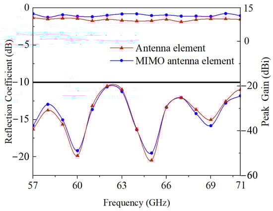 The simulated reflection coefficient and peak gain of antenna element and MIMO antenna element.