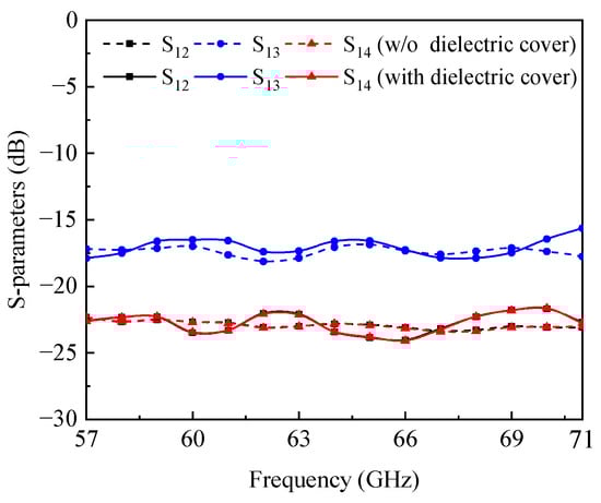 The isolation between the antenna elements plays a crucial role in influencing the performance of the MIMO antenna. Through the orthogonal arrangement of four antenna elements, adjacent elements achieve orthogonal polarization, resulting in high isolation between them. However, elements with opposing positions are unable to achieve orthogonal polarization. The presence of metal vias near the ladder-shaped slot can enhance the isolation between them. With the inclusion of metal vias, the mode excited in one antenna element is confined within the ladder-shaped cavity, exerting minimal influence on another antenna element. As illustrated in Figure 11, the isolations between different antenna elements consistently exceed 15 dB across the entire operational bandwidth. The impact of the dielectric cover on isolation is negligible, as indicated in Figure 11. Each antenna element functions effectively from 57.0 GHz to 71.0 GHz, respectively. By manipulating the operational state of each antenna element, the beam coverage can be easily adjusted.