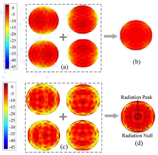 The simulated radiation patterns of the proposed antenna at 64 GHz. (a,c) The radiation patterns of four ports without and with the dielectric cover, respectively. (b,d) The enveloped radiation pattern of the MIMO antenna without and with the dielectric cover, respectively.
