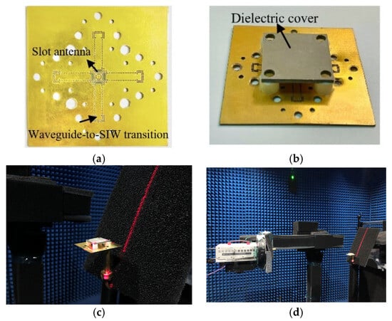 To verify the proposed design, the prototype of the 2 × 2 MIMO antenna was fabricated and measured. The conventional PCB processing was used to machine the Rogers 5880 with a thickness of 0.787 mm for the substrate and Rogers 6006 with a thickness of 1.905 mm for the dielectric cover, respectively. The photographs of the fabricated antenna without and with the dielectric cover are shown in Figure 13a,b. It was tested in the mmWave/THz quasi-in air-based antenna measurement setup built at Shanghai Jiao Tong University, China, as shown in the Figure 13c,d. The proposed antenna was connected to the standard WR-15 for measurement. The S-parameters were measured using a Ceyear 3672D vector network analyzer. The radiation patterns were tested using the mmWave/THz quasi-in-air-based antenna measurement setup.
