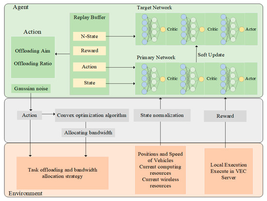 DRL has achieved success in several areas by utilizing the perceptual and decision-making ability of deep learning and reinforcement learning [6,19]. Therefore, many scholars have considered using DRL as a decision-making algorithm. The researchers in [20] propose a dynamic pricing strategy that utilizes stationary vehicles as computing service merchants. The goal is to optimize the service provider’s computing income while reducing the user’s energy usage. However, because the value-based Q-learning algorithm is used, there are significant limitations in selecting the action space to achieve the best results. The researchers in [21] examined a multi-user Mobile Edge Computing network with time-varying fading channels and proposed an improved DQN-based offloading strategy for the offloading decision and resource allocation problems. The researchers in [22] recommended a vehicle-end-edge cloud architecture to offload task computations, utilizing an A3C-based offloading method to ascertain the optimal decision. This approach considers both efficiency and fairness. The authors in [23] considered the user’s budgetary restrictions while designing a vehicular network system based on MEC to minimize delays. The proposed approach combines DQN and a convex optimization algorithm with deep reinforcement learning. The authors in [24] proposed a multitask, multi-user MEC system, developed a computational model for joint task offloading and caching, and, finally, optimized the offloading and caching strategies using a DQN-based deep reinforcement learning algorithm. The authors in [25] encouraged vehicles to share idle compute resources, classify tasks by task size and priority, and finally achieve task offloading by maximizing the average utility of the considered network. The authors in [26] considered the utilization of the idle resources of the vehicle; the hybrid task offloading is performed by the V2V and V2I modes to maximize the utilization efficiency of the resources. The authors of [27] jointly optimized service caching and computation offloading in a time-varying IoV environment, formulating the problem using long-run mixed-integer nonlinear programming (MINLP) and solving it using deep reinforcement learning algorithms to minimize latency. The authors in [28] proposed a multi-intelligence-based task offloading scheme to optimize the offloading and resource allocation strategy according to the task priority size to improve the average utility of the vehicle, but less consideration was given to the energy consumption aspect of task offloading.