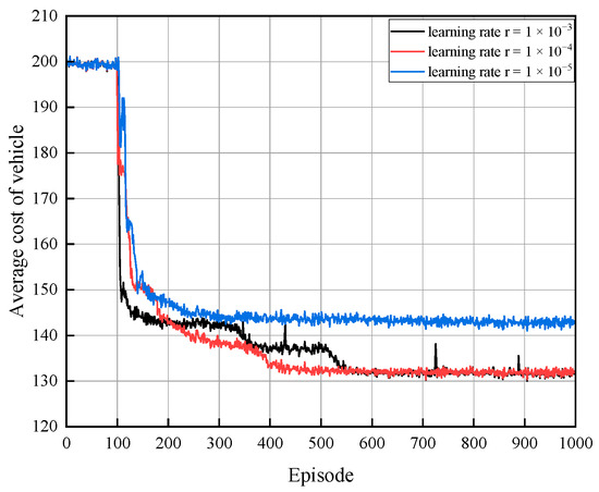 The HTCO algorithm’s neural network training and updating are impacted by the rate of learning. If the learning rate is too high, it can cause the optimal solutions to be overlooked and the stability to be compromised during the optimization process, whereas if the learning rate is too low, it may result in a local optimum or slower convergence. The number of trainings is depicted on the horizontal axis in Figure 3, while the total cost of processing the task in T timeslots for any vehicle is represented by the average cost of the vehicles on the vertical axis. When the learning rate of the network is 1 × 10−5, the average cost of vehicles decreases with the number of iterations, but its optimal solution is not as good as when the learning rate is 1 × 10−4 and 1 × 10−3. A higher learning rate results in an increased update rate for both the actor and the critical network, whereas the optimal solution necessitates minimal updates. A learning rate of 1 × 10−3 can yield the optimal solution, yet it is prone to becoming ensnared in the local optimal solution due to the insufficient learning rate. Consequently, we choose 1 × 10−4 as the learning rate. When the learning rate of the network is 1 × 10−4, the system will be able to achieve an optimal solution that is both converged and stable after 400 iterations.