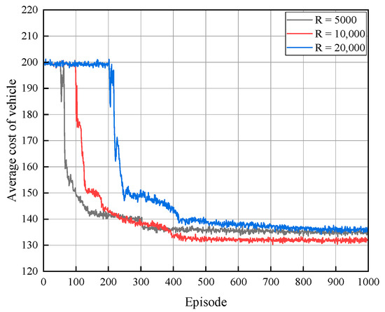 The experience replay buffer has an impact on the algorithm’s training time, optimality, and convergence. As shown in Figure 4, when the experience replay buffer is 5000, the local optimal solution can be attained after 300 iterations, yet the global optimal solution cannot be attained in the end due to the empirical buffer being relatively small, which has an impact on the feature information of the extracted data, and the optimal strategy cannot be acquired. Once the experience replay buffer is 10,000, the optimal solution can be attained after 400 cycles. When the experience replay buffer is 20,000, the global optimal solution is not obtained, which is due to the relatively slow update of the data because the buffer is too large. Consequently, we adjusted the experience replay buffer parameter to 10,000.